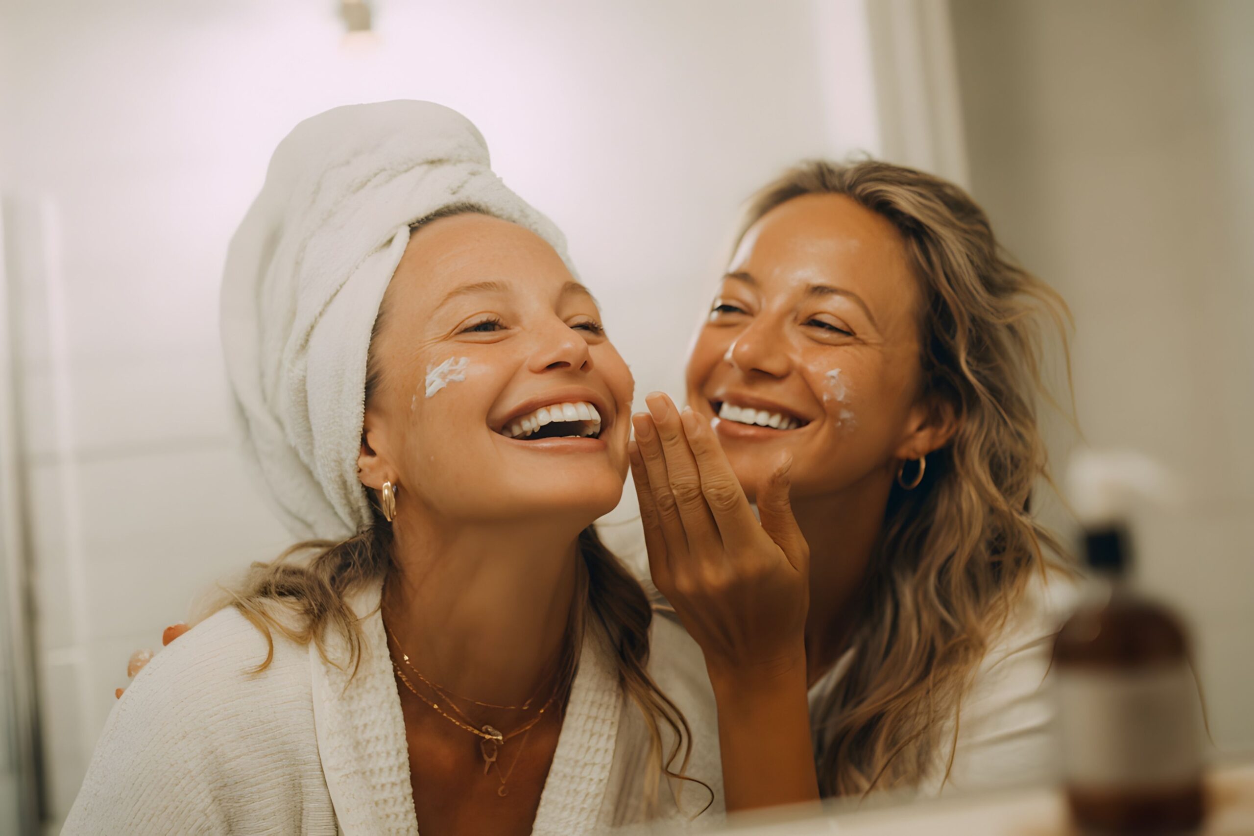 Two young European women applying cold weather skincare moisturizer during winter morning routine with natural window lighting