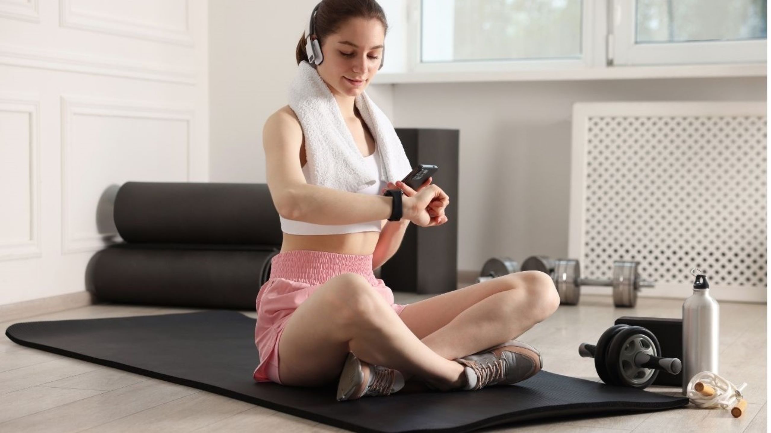 European woman checking wearable fitness tracker showing health data representing wellness trends 2026 with AI-powered personalized technology monitoring heart rate and mental fitness metrics