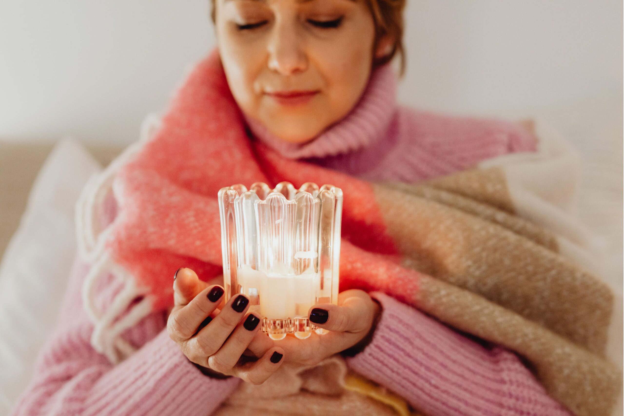 Woman enjoying winter wellness with candles in Danish hygge style interior featuring warm lighting and cozy textiles